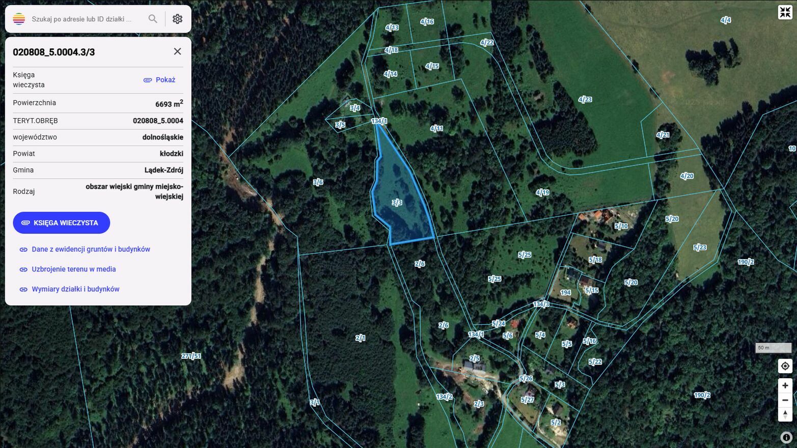 Działka o powierzchni 6693 m², położona w gminie Lądek-Zdrój (powiat kłodzki, Dolnośląskie), w otoczeniu łąk, lasów i malowniczych wzniesień.